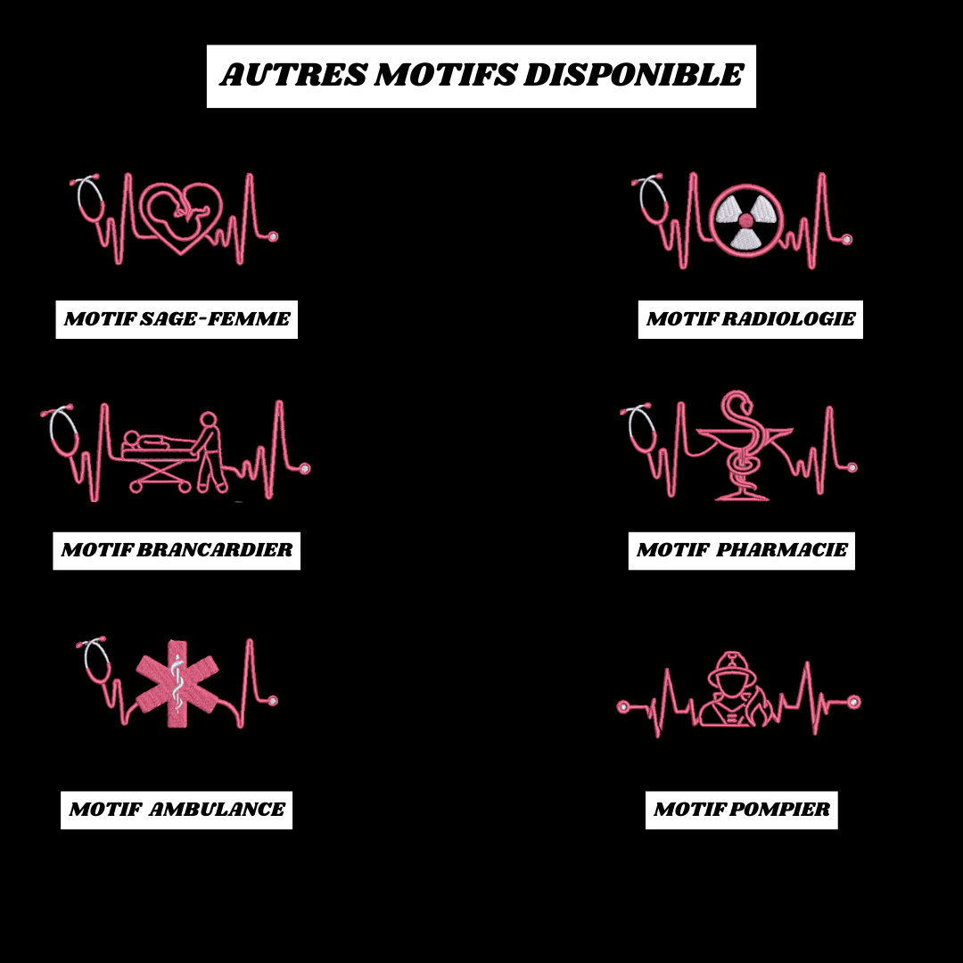 Broderie personnalisée : prénom + fonction + motif + coloris du motif.