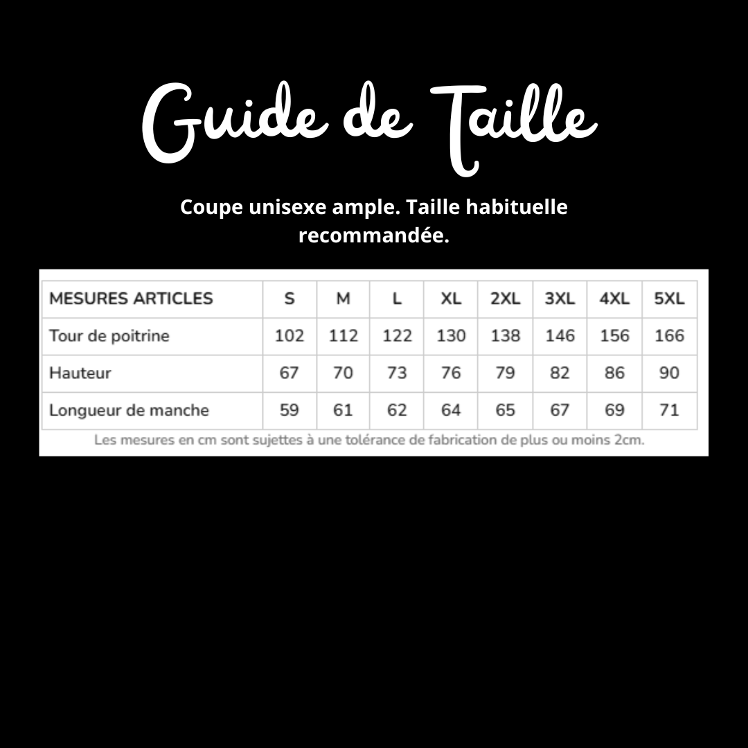 Coupe oversize unisexe : prenez votre taille habituelle ou maximum une taille supplémentaire si vous aimez que cela soit large.