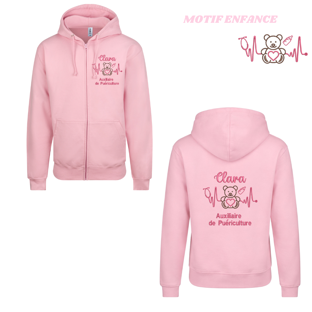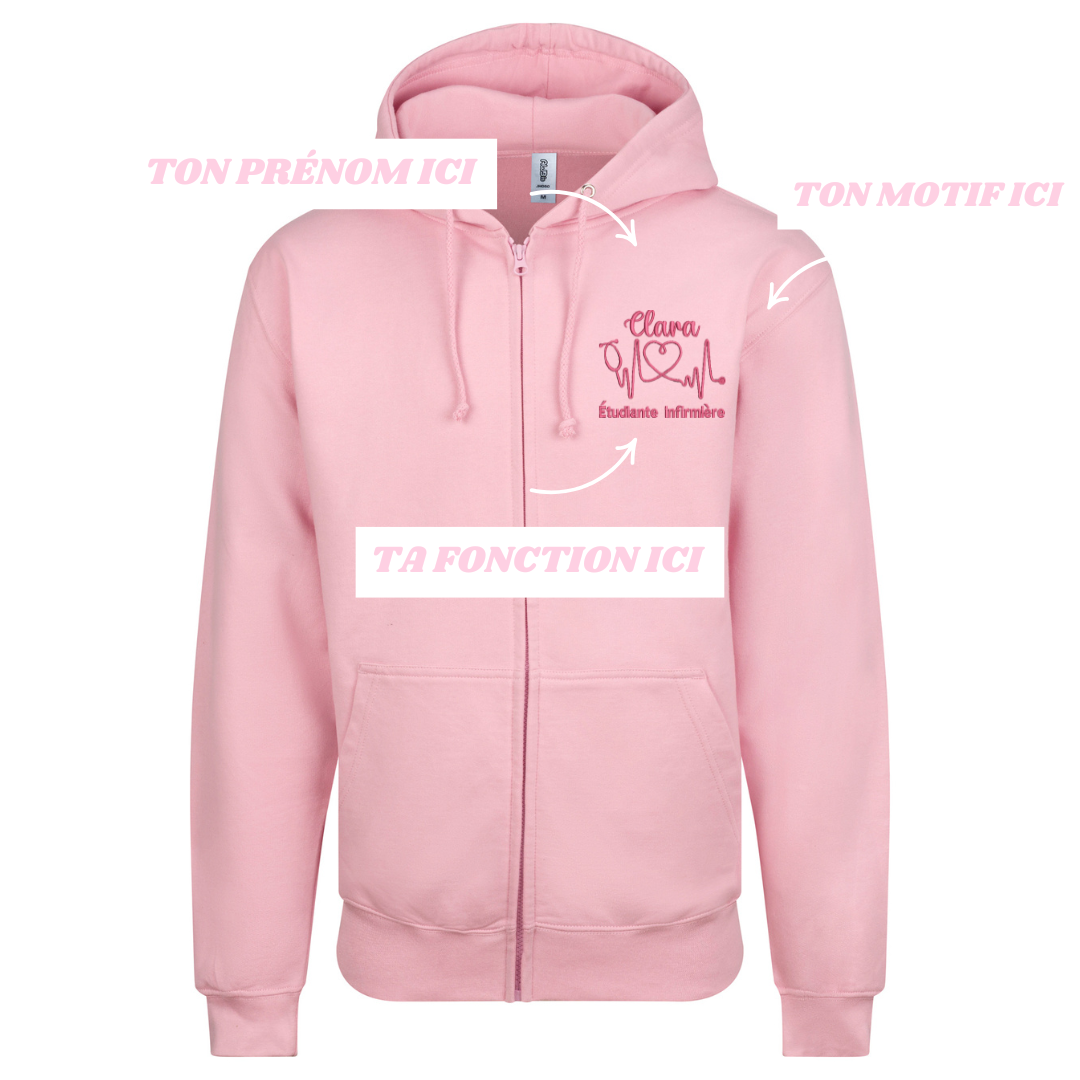 Veste sweat zippée rose pastel personnalisée – Broderie cœur et/ou dos 🩷